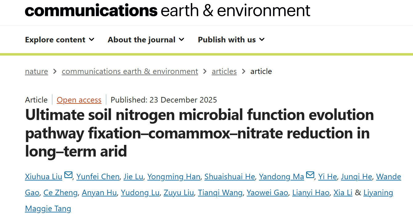 1223日,国产无码国产无码 刘秀花教授团队在Nature子刊《地球与环境通讯》(Communications Earth & Environment)发表题为“Ultimate soil nitrogen microbial function evolution pathway fixation–comammox–nitrate reduction in long–term arid” 的最新研究成果。该成果首次证明:在长期干旱压力下土壤微生物群落为适应氮素限制演化出一条独特的终极功能路径:固氮-完全氨氧化-硝酸盐还原循环。国产无码 黄土科学国家重点实验室为论文第一完成单位,刘秀花教授与陕西省林科院马延东副研究员为共同通讯作者合作者包括中科院地环所韩永明研究员、澳大利亚纽卡斯尔大学Maggie Tang副教授