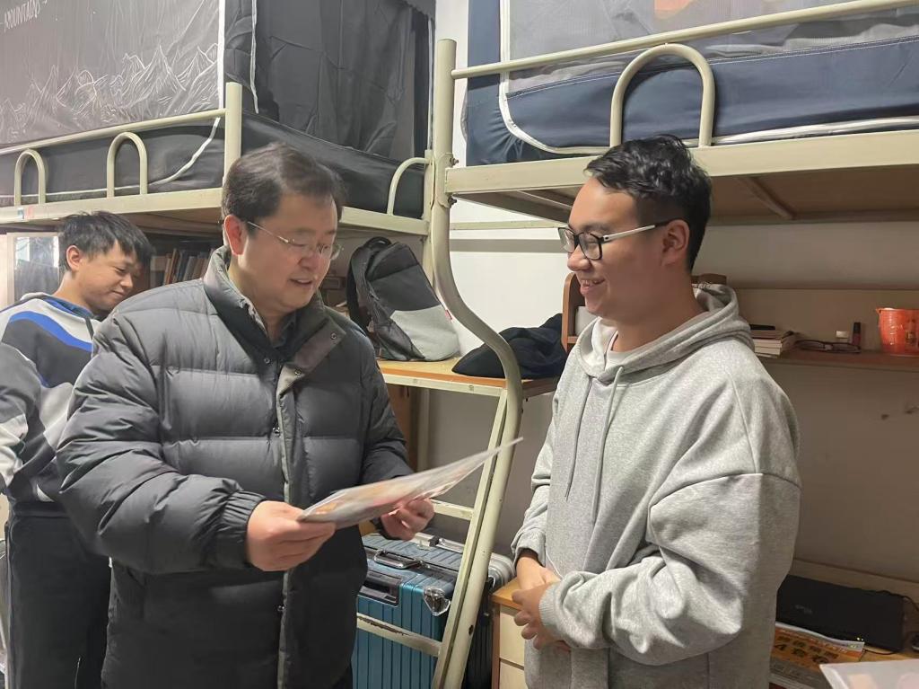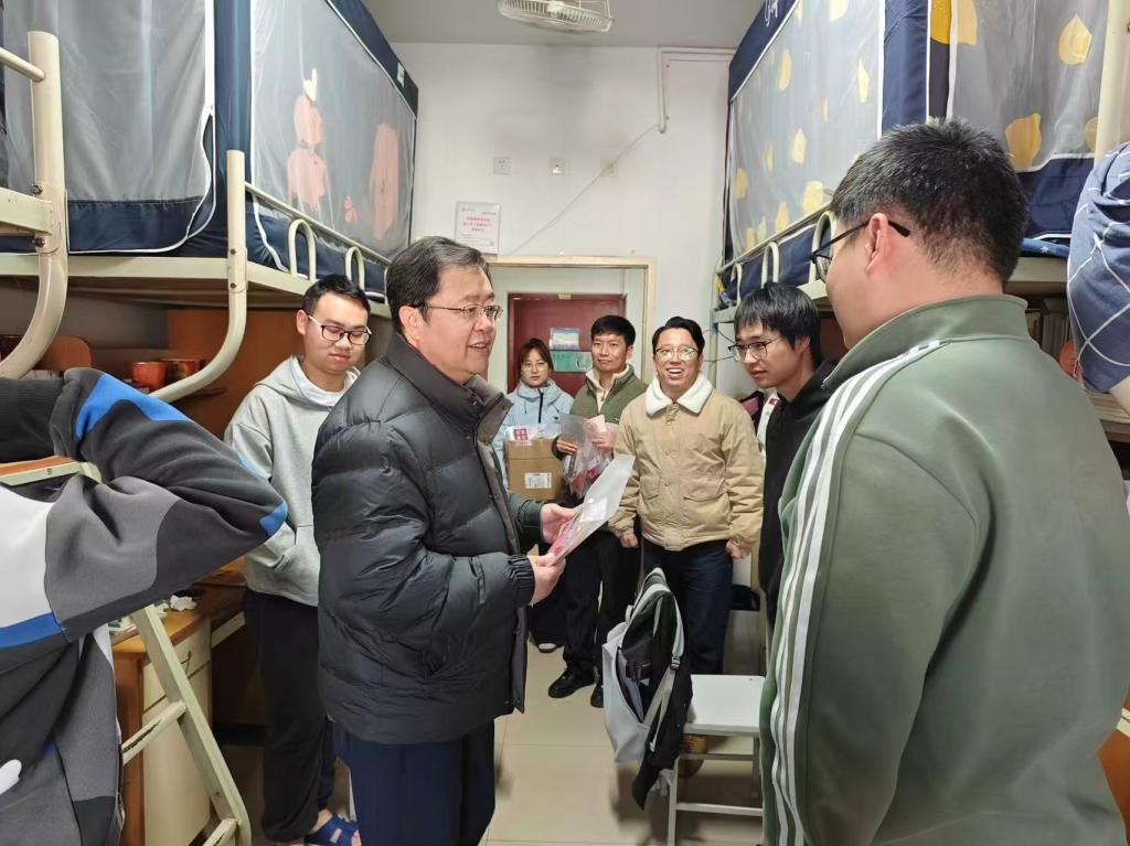 领导班子与考研学生代表座谈,同时带领辅导员深入宿舍走访慰问。老师们与备考学子亲切交谈,细致了解每位同学的复习进度及实际需求,叮嘱大家劳逸结合,既要全力以赴冲刺目标,也要保持平和心态,尤其要做好冬季防寒保暖。同时,老师们重点关注宿舍安全,提醒同学们增强安全防范意识,保持宿舍整洁通风,为备考营造安全舒适的环境。